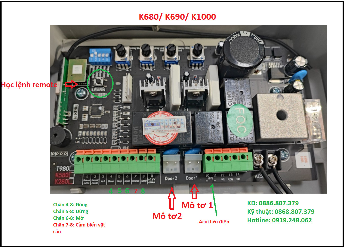 Sau khi đấu dây xong tiến hàng ghim jack mô tơ vào board. Cánh cửa nào mở trước ghim vào cổng số 2, mở sau ghim vào cổng số 1.