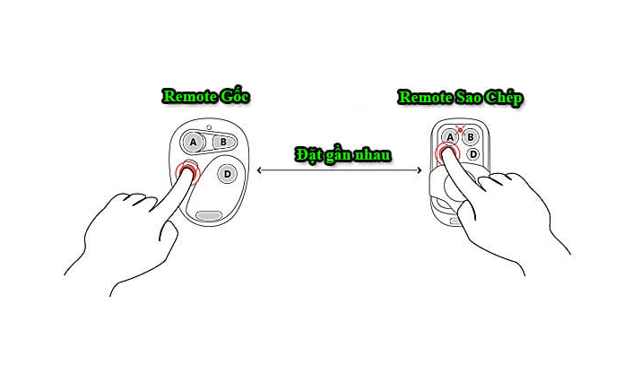 Bấm và giữ đồng thời 2 nút A và B trên remote sao chép. Sau khoảng 5 giây thì đèn led sẽ nhấp nháy 1 lần và nhấp nháy nhanh hơn sau đó.Lúc này các mã khóa được lưu trong bộ nhớ đã được xóa bỏ.
